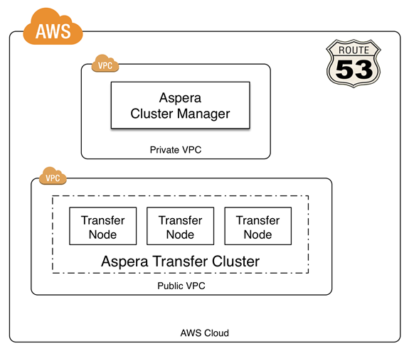 The IBM Aspera Transfer Cluster Manager (ATCM) is used to deploy, manage and monitor fleets of Aspera clusters in the cloud. The Cluster Manager is packaged on a virtual machine and can provision clusters of Aspera servers by using a deployment template. The clusters are deployed in a virtual private cloud (VPC). The following diagram shows the basic architecture and deployment models.