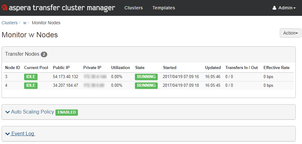 To view the cluster's auto scaling configuration, click Auto Scaling Policy. To disable auto scaling, click Action > Disable Auto Scaling. The cluster continues to run but does not launch new nodes if the transfer load increases.
