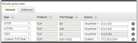 Type Protocol Port Range Source Port Range Description HTTP TCP 80 Anywhere 0.0.0.0/0 External users and systems use this port for browse access to Cluster Manager. HTTPS TCP 443 Anywhere 0.0.0.0/0 External users and systems use this port for browse access to Cluster Manager. SSH TCP 22 Anywhere 0.0.0.0/0 (or your custom IP address) Administrators use this port to SSH into the Cluster Manager. Cluster nodes also use this port to access the cluster-upgrade script. Custom TCP Rule TCP 5001-5002 Custom