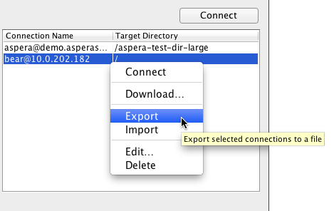 You may also import your connection list to and export your connection list from a text file. To export your connection list, right-click the remote server panel and select Export. To import your connection list, right-click the remote server panel and select Import. Both options are shown below (with "export" selected).