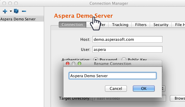 To name or rename a connection, click the orange connection profile name that appears at the top of the screen. The Rename Connection dialog appears. You can also launch the Rename Connection dialog by clicking once on an already selected connection name in the left panel of the Connection Manager. When you have entered the new name, save it by clicking OK (once in the Rename Connection dialog and again in the Connection Manager).