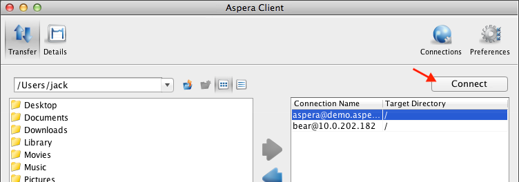 Test client functionality by transferring to and from the Aspera Demo
