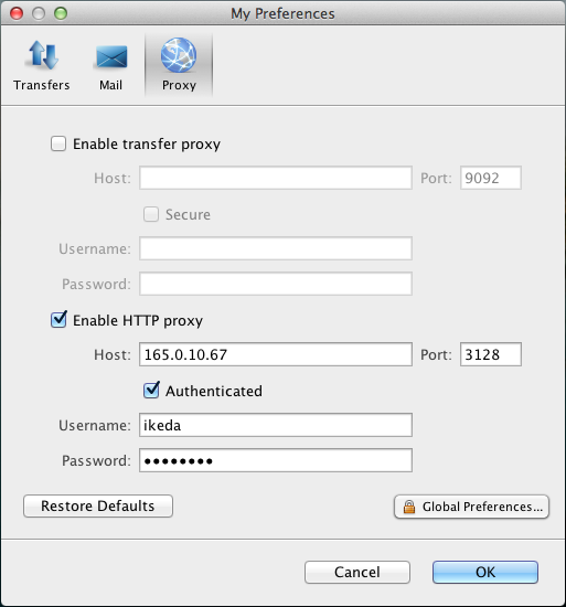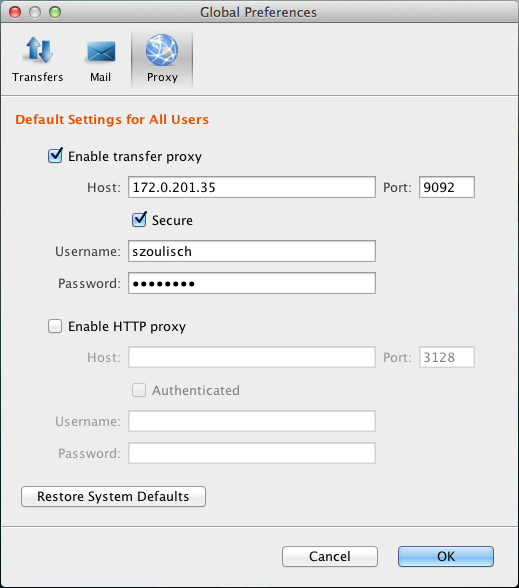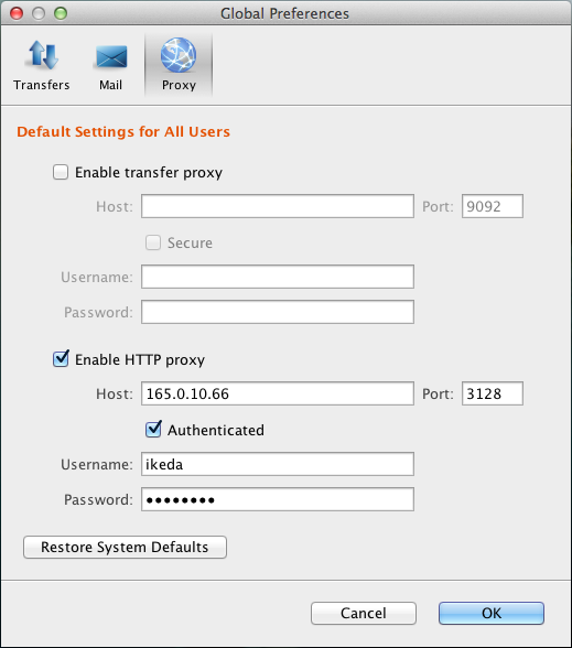 By default, all proxy settings are turned off. For global preferences, clicking Restore System Defaults clears all settings.
