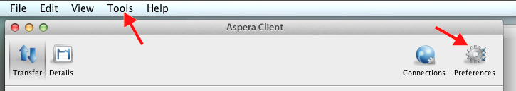 If, for network-security reasons, you are behind a proxy server or an HTTP proxy server, you can enable these proxies for file transfer by configuring settings in the Preferences dialog. Preferences can be accessed either from the Preferences button in the upper-right corner of the desktop client window menu, or from the Tools button in the main toolbar.