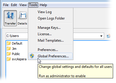 To set global FASP bandwidth, bring up the application and select Tools > Global Preferences. Global bandwidth can be set by administrators only.