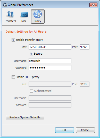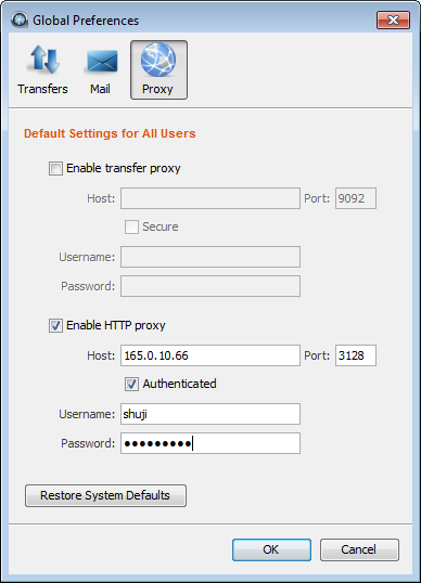 By default, all proxy settings are turned off. For global preferences, clicking Restore System Defaults clears all settings.