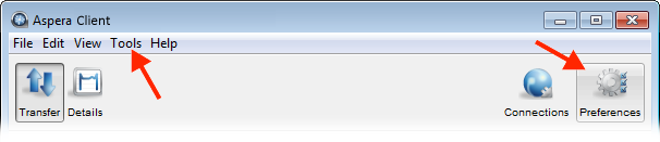 If, for network-security reasons, you are behind a proxy server or an HTTP proxy server, you can enable these proxies for file transfer by configuring settings in the Preferences dialog. Preferences can be accessed either from the Preferences button in the upper-right corner of the desktop client window menu, or from the Tools button in the main toolbar.