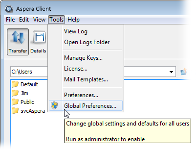 If you have admin privileges, you can enable transfer proxies for all users by setting global preferences. If you are a non-admin user, you can override global transfer-proxy settings for your own account, including enabling or disabling the feature.