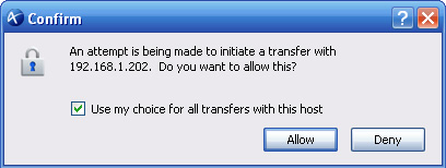 Before the transfer session starts, a dialog box asks you if you want to allow the transfer to continue. Select Allow to confirm. If you check Use my choice for all transfers with this host this dialog box will not show up in the future.