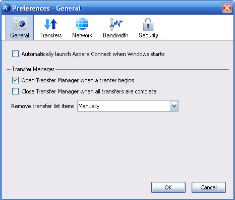 The first thing you see in Preferences is the General tab. You can indicate here whether or not you want to launch Aspera Connect automatically.