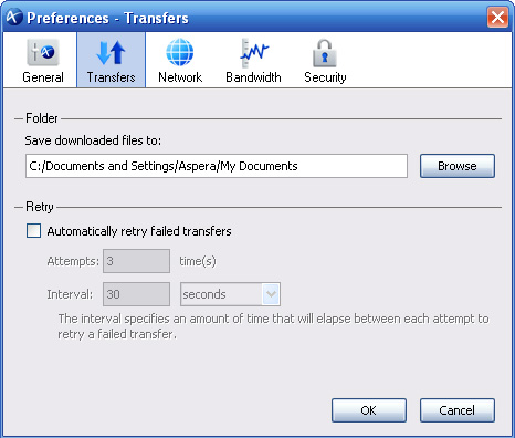 In the Transfers section, you can find the download folder and retry rule settings. Click Browse and select a folder to save the downloaded files. If you want to enable the auto-retry function, check the Automatically retry failed transfers and enter a value in attempts and interval.