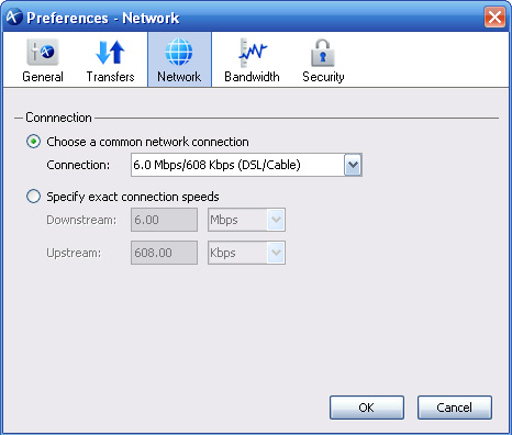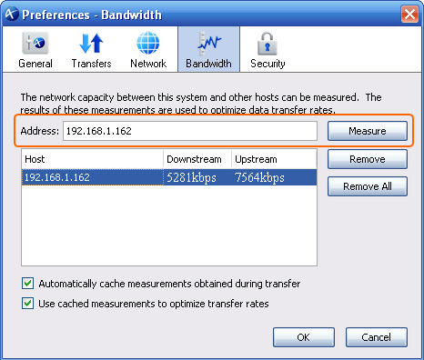 If the server supports auto bandwidth discovery, the Bandwidth tab allows you to utilize this feature. Please consult the server administrator about whether the server supports bandwidth discovery. To probe the optimal transfer rate between the server and your computer, enter the server's address and click Measure.