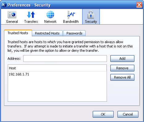 The Security tab allows you to manage all the servers with which you connect. As you connect to a server, you are asked whether you want to allow the connection.