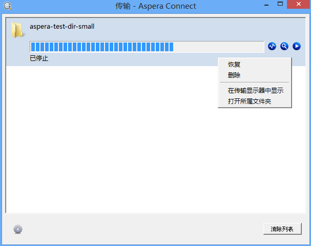 您可以在 Aspera Connect 传输窗口中查看和管理所有传输会话。