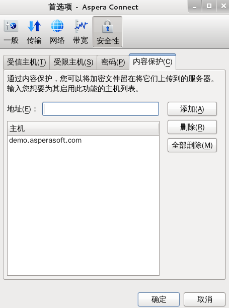 要添加要求在传输过程中对上传的文件进行加密的主机,请单击安全性选项下的 内容保护选项卡。在“地址”文本字段中输入您的 Aspera 服务器地址,然后单击 添加。该服务器将添加到主机列表中。