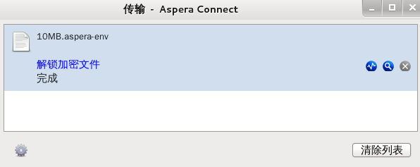 下载完成后,请检查您的 Aspera Connect 传输窗口。如果您在下载 期间输入了用来解密文件的密码(上面的选项 1),您将能够打开解锁的文件,而无需采取进一步操作。如果您选择下载内容受保护的文件并且在完成下载之后解密文件,则会收到一条让您解锁加密文件的状态消息,以及指向 Aspera 解密实用程序的链接。