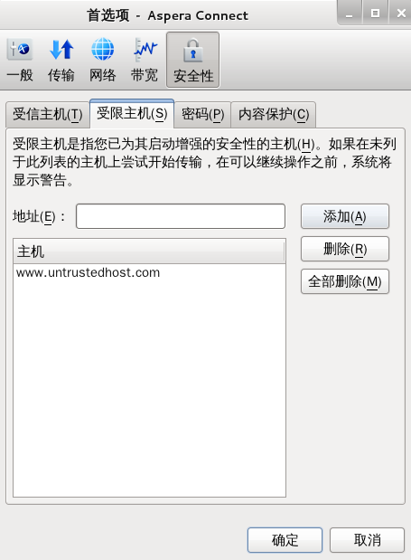 在启动传输并且在确认对话框中启用了针对与此主机的所有传输应用我的选择选项时,您要允许或拒绝的服务器将分别添加到受信主机或受限主机列表中。要查看、添加或删除其它受信主机,请转至。在指定的文本字段中输入主机的地址,然后单击添加。