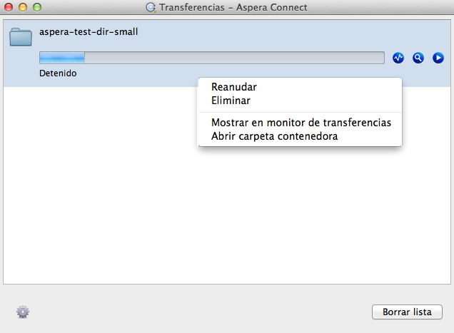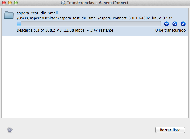 Puede ver y administrar todas las sesiones de transferencia en la ventana Transferencias de Aspera Connect.