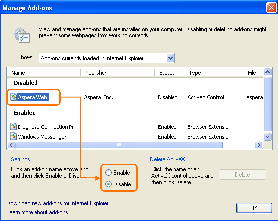 ここで誤って[実行しない]をクリックした場合は、後でAsperaサーバーWebページの下部にあるギアアイコンをクリックします。[アドオンの管理]ウィンドウが表示されます。[Aspera Web]を選択して、[設定]で[有効にする]を設定します。