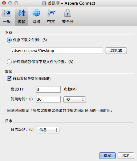 Aspera Connect 的传输行为可在传输首选项下配置。