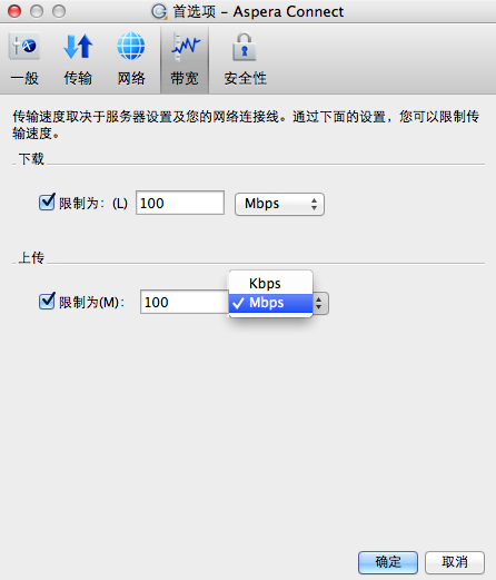 除非您需要限制 Aspera Connect 使用的带宽,否则不应该在这些字段中设置任何值。