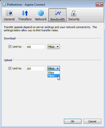 You may limit the download and/or upload transfer rates by enabling the respective checkboxes and inputting a rate in either Mbps or Kbps. Note that your ability to limit these rates depend on the following factors: