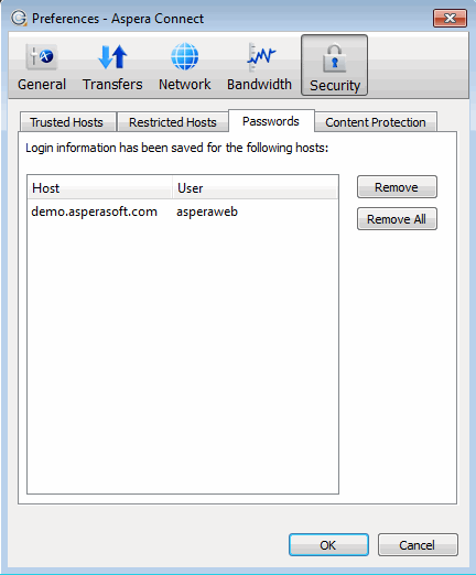 To add hosts that require uploaded files to be encrypted during a transfer, click the Content Protection tab under the Security option. Type your Aspera server address in the Address text field and click Add. The server will be added to the host list.