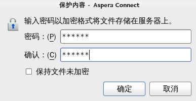 将文件上传到配置为内容保护主机的服务器时,将会显示确认窗口,提示您输入用来加密文件的密码。您可在文本字段中输入密码,或者选中保持上传文件不加密 (如果服务器允许), 在不使用此功能的情况下继续。单击确定开始传输。