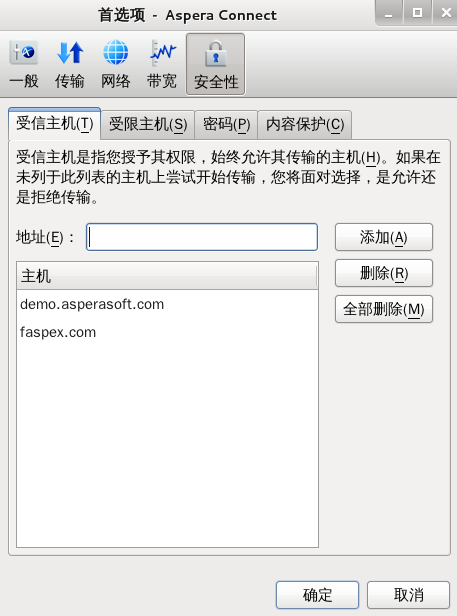 在启动传输并且在确认对话框中启用了针对与此主机的所有传输应用我的选择选项时,您要允许或拒绝的服务器将分别添加到受信主机或受限主机列表中。要查看、添加或删除其它受信主机,请转至。在指定的文本字段中输入主机的地址,然后单击添加。