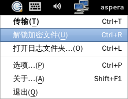 注意,您还可以从 Aspera Connect 应用程序菜单中解锁加密文件(选择以下显示的解锁加密文件选项)。