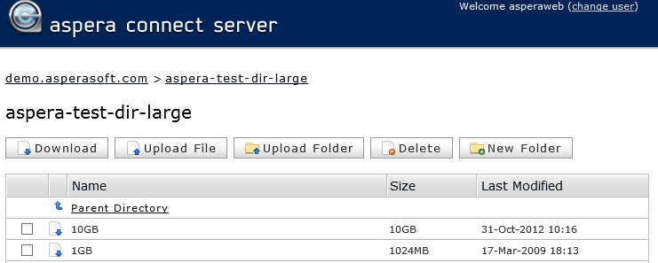在确认配置设置正确并且 Aspera Connect 正常工作后,便可以使用您所在组织的 Aspera 服务器开始传输。只需将浏览器指向您的服务器的地址(例如 http://companyname.com/aspera/user)即可开始操作。
