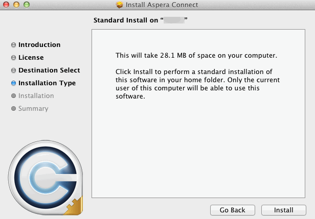 Puede descargar el archivo DMG de Aspera Connect directamente desde http://www.asperasoft.com/download_connect/. Una vez descargado, ejecute el instalador en su máquina. Deberá aceptar los términos y condiciones y hacer clic en el botón Instalar.