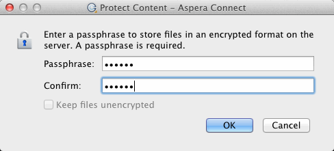 Al subir archivos a un servidor que está configurado como un host con protección de contenido, aparece una ventana de confirmación que le pide una contraseña para cifrar el archivo. Puede introducir la contraseña en el campo de texto o activar Mantener archivos sin cifrar (si lo permite el servidor) para continuar sin utilizar esta característica. Haga clic en Aceptar para iniciar la transferencia.
