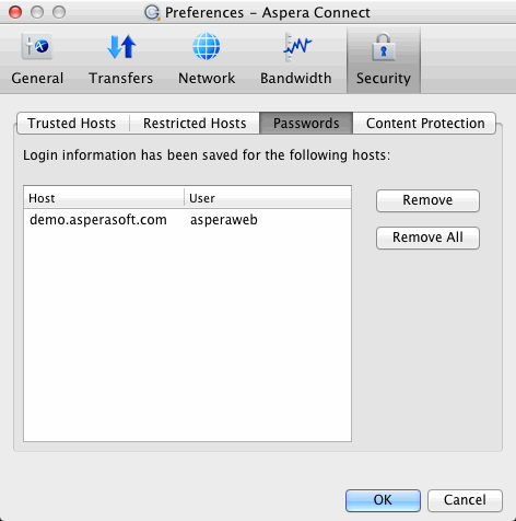 Para agregar hosts que requieren el cifrado de los archivos subidos durante una transferencia, haga clic en la ficha Protección de contenido de la opción Seguridad. Introduzca la dirección del servidor Aspera en el campo de texto Dirección y haga clic en Agregar. El servidor se agrega a la lista de hosts.