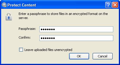 When uploading files to a server that is configured as a content-protected host, a confirmation window will appear and prompt you for a passphrase to encrypt the file. You can enter the passphrase in the text field, or check Leave uploaded files unencrypted (if allowed by the server) to proceed without using this feature. Click OK to start the transfer.