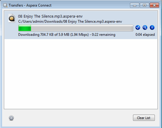 As the content-protected file is being downloaded to your computer, the file icon will change to that of the aspera-env file type in the Connect Transfers window.