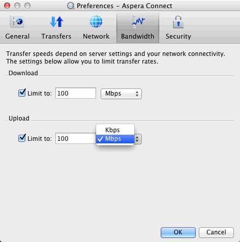 - Your Aspera server transfer settings: Settings on your server may limit your transfer rate even if your network bandwidth and the numbers you enter are larger.