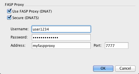 When FASP proxy is enabled, Aspera will pass the DNAT or DNATS (secure) username, server address, and port to ascp.