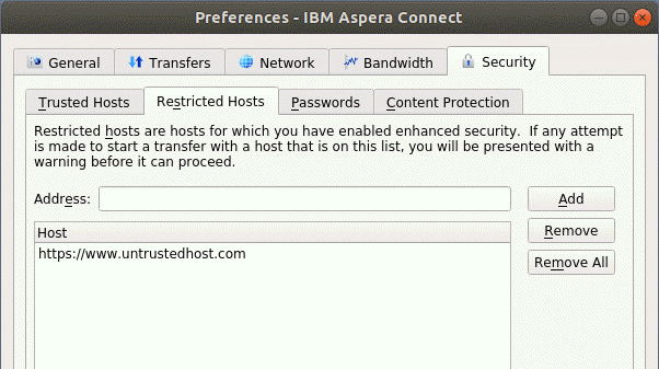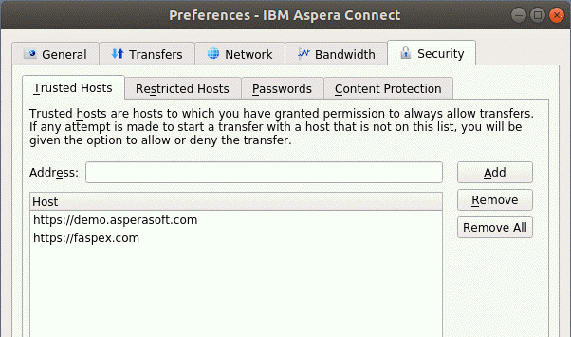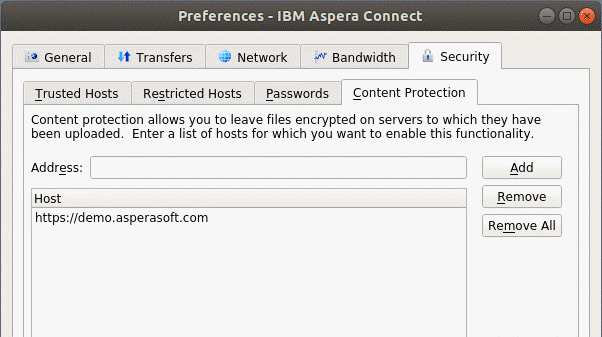 To specify hosts to which you want all uploads to be encrypted, open the Content Protection tab under Security. In the Address field enter the Aspera server address and click Add. The server is then added to the list.