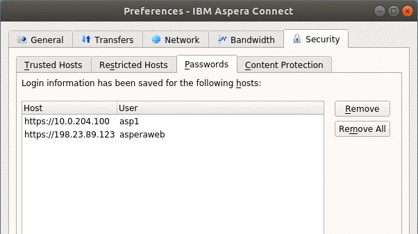 To view, add, or remove saved password information for a host, go to Security > Passwords. Here, you can remove saved login credentials; however, you cannot add credentials to this list directly. Whenever you attempt a transfer with a server where your credentials are not saved, you are prompted with an authentication dialog and offered a Remember this password checkbox. Marking the checkbox causes your login credentials to be saved and appear in this tab.