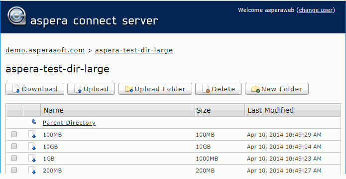 Open your web browser and log in to Aspera's demo transfer server at http://demo.asperasoft.com/aspera/user.