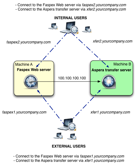 - Your internal users communicate with the transfer node via xfer2.yourcompany.com.