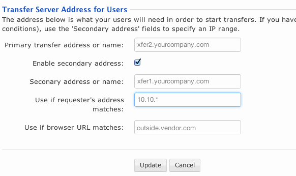 - Your external users communicate with the transfer node via xfer1.yourcompany.com. In addition to specifying a secondary address/name, you can also set conditions for when the secondary address will be used (e.g. if the requester's IP address matches X.X.X.X or the browser URL matches outside.vendor.com).