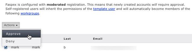If you approve users, they will automatically inherit the permissions of the template user and will become members of a workgroup(s), if configured to do so. Note that you still update their permissions and workgroup memberships from the Users tab.