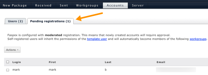 This topic assumes that you have turned on the moderated self-registration setting. Once a user self-registers, you will see the Pending Registrations (X) tab under your Accounts menu (where X stands for the number of pending registrations).