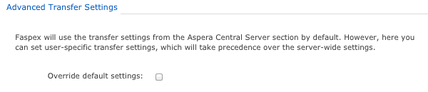 Faspex uses the transfer settings from the Aspera Central Server section by default. However, when Override default settings is checked, you can set user-specific transfer settings, which will take precedence over the server-wide settings.