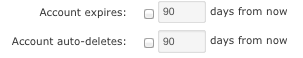 | Account expires | (Disabled by default) Enable this setting if you would like a self-registered user's account to expire (i.e. deactivate) after "X" number of days (where "X" is any integer). Once the account expires, that user will no longer be able to log into Faspex, unless you re-activate the account. Note that within the Accounts list, inactive accounts are shown in gray. Packages sent to this user will remain on the server (if configured to do so). |