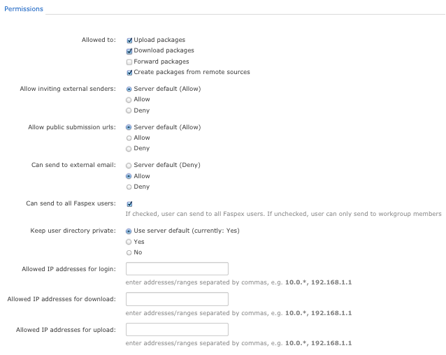 | Allowed IP addresses for upload | Specify the IP address(es) that a Faspex user can login from to upload packages. A wildcard (*) can be used in this option (e.g., 192.168.10.*., which allows the user to login from 192.168.10.1, 192.168.10.2, etc.). Separate multiple email addresses with commas (,). |