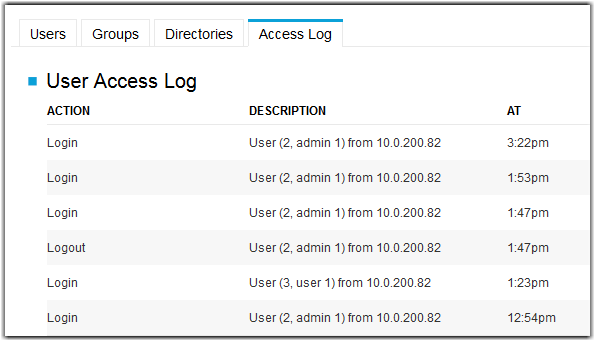 Once you have created accounts for Console users, you can monitor their activity from the Accounts > Access Log tabs. The User Access Log displays user logins and logouts, concurrent logins and session timeouts.