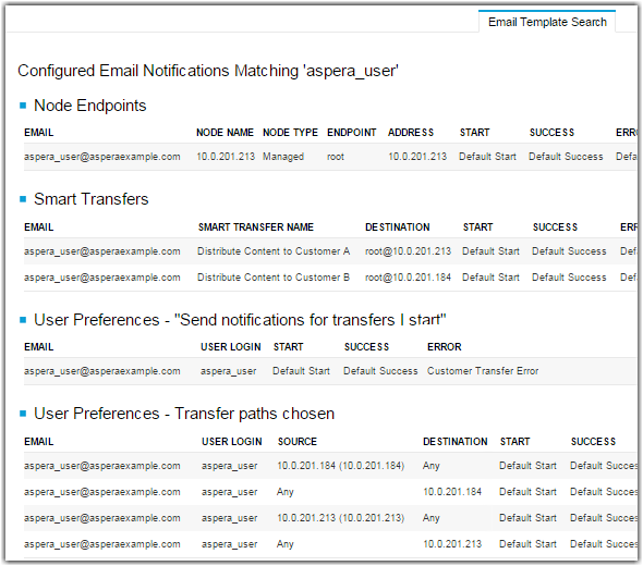 In the example below, the results display all pre-configured email notification